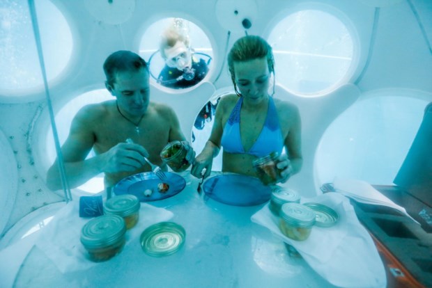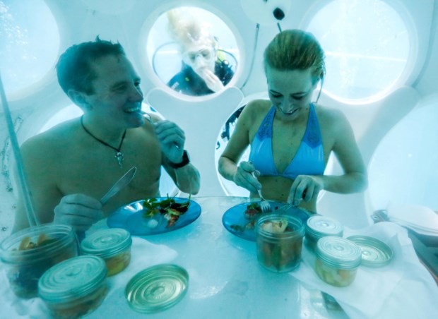 O equipamento de mergulho é apenas utilizado na viagem subaquática até à “pérola”. Depois há que deixá-lo junto à base da cápsula e esgueirar-se para dentro da sala de refeições, uma bolsa de ar completamente submersa. A comida é servida por mergulhadores experientes em caixas à prova de água, num menu composto por foie gras, salada de lagosta e champanhe. Custa 99€ por pessoa.