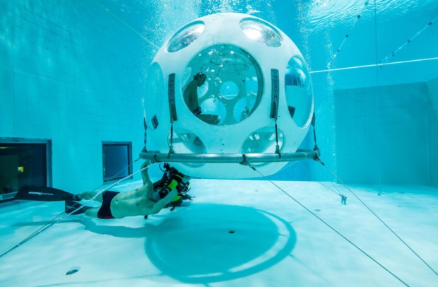 É esta a proposta original de The Pearl, um “restaurante” subaquático construído numa das piscinas do centro de mergulho Nemo33, em Bruxelas. A refeição é servida numa esfera branca com cerca de dois metros de largura, presa junto a uma das plataformas submersas no interior da piscina, cinco metros abaixo da superfície.
