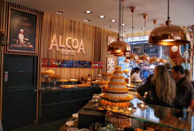 Dois anos de trabalhos depois, a Alcôa abriu finalmente portas na esquina entre a Rua Garret e a Rua Ivens, em Lisboa. Os azulejos continuam a colorir a fachada de azul e branco, mas lá dentro as cautelas e as raspadinhas deram lugar aos tons quentes do cobre e a muitos, muitos doces conventuais.