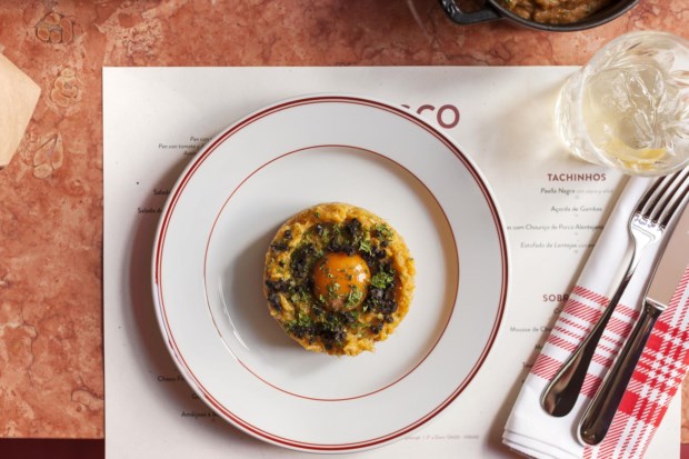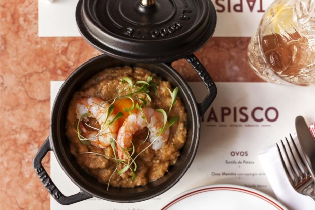 A ementa do Tapisco tem pratos espanhóis e portugueses — cada um na sua língua de origem. Na frente lusa, há salada de polvo (12 euros), choco frito (12 euros), bacalhau à Brás (14 euros) e açorda de gambas (19 euros) – bem confeccionados e sem grandes invenções. Do lado espanhol, além dos mais conhecidos huevos rotos con paletilla (12 euros) e patatas bravas (6 euros), encontra, por exemplo, a paella negra con choco (28 euros) e a esqueixada de bacalao (10 euros) – um prato tipicamente catalão com bacalhau de meia cura, tomate e uma vinagrete.
