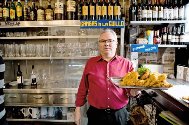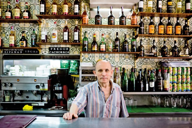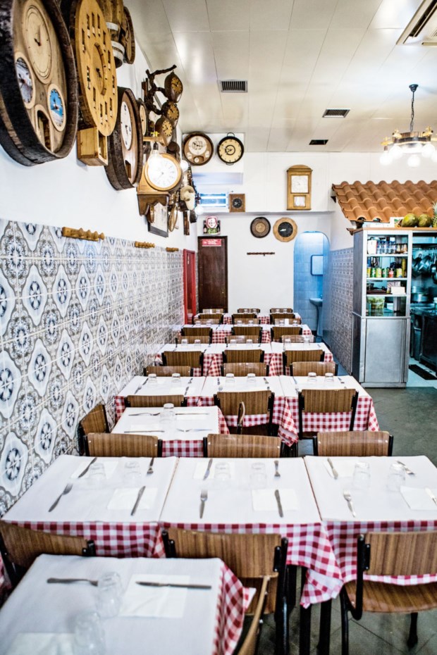 O estabelecimento virá já dos anos 30, pertenceu a uns galegos, mas o sr. Américo, que antes trabalhava numa das casas de ginginha do Rossio, tomou conta dele em 1988 – sabe bem a data, foi no ano do incêndio do Chiado, um bairro histórico no centro de Lisboa. As paredes estão cheias de relógios e só isso valeria a visita. São o hobby do sr. Américo, que aos domingos, dia de folga, se entretém a montar sistemas de relojoaria em tampas de barris, fundos de pratos, azulejos ou qualquer outro suporte. “Sabe-me dizer quantos são?”, desafia-nos. Gosta de adivinhas e ficamos ali, em conversa de balcão, enquanto vão aparecendo clientes para beber um copito.