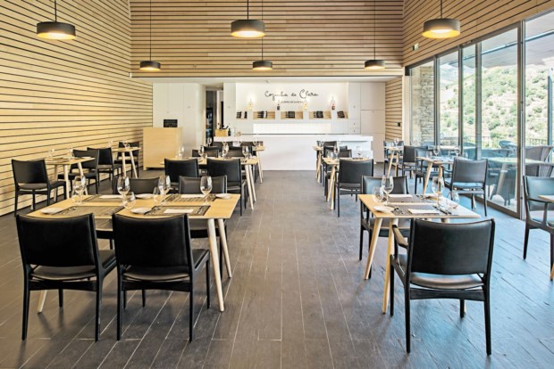 O arquitecto criou então este espaço sóbrio, com um tecto muito alto, de madeira clara, paredes brancas, chão negro como o xisto da região, e a tal parede negra ao fundo, onde foi colocado o quadro que representa Claire, iluminado por um foco de luz. Na parede do outro lado da sala, está escrito Cozinha da Clara, com a caligrafia da própria.
