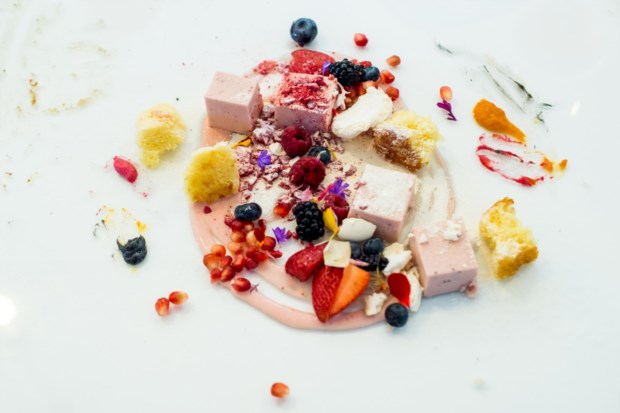 Os pratos são pensados para cruzar sabores e cores e – é precisamente isso que se pretende – “abrir os sentidos”. A sobremesa leva o conceito ao limite e é servida pelo chef e a sua equipa, na mesa, como quem pinta um quadro, neste caso com frutos vermelhos (e, noutro desafio, acompanhado por um dos rosés da Adega Mayor, o Caiado, com as castas Aragonez, Castelão e Touriga Nacional).