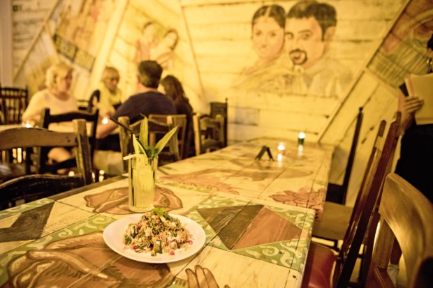 Outra imagem de marca da casa são as dosas, os grandes crepes finos e estaladiços, de massa feita com farinhas de lentilhas e arroz e que é deixada a fermentar durante a noite (“não usamos pré-preparados”, orgulha-se Aparna). Típicas do Sul da Índia, onde se comem geralmente ao pequeno-almoço, as dosas conquistaram o resto do país e agora o mundo. Aqui servem-se em formato megafone e recheadas com batata ou, em versão cónica, com pato, acompanhadas por chutney de coco.