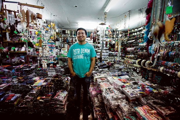 O interior da loja, das paredes até o tecto, está repleta de brincos, colares, anéis e ganchos. É daqui que saem muitos produtos de bijutaria que são vendidos nas lojas chinesas, e que chegam a Portugal em navios que têm que dar a volta ao mundo.