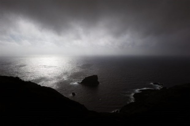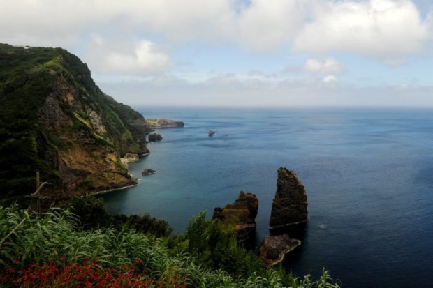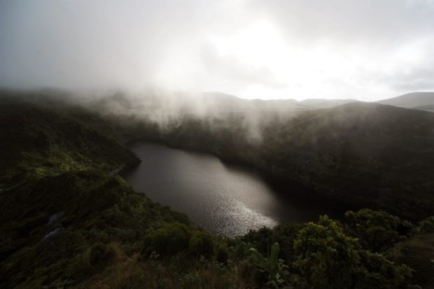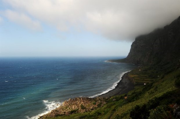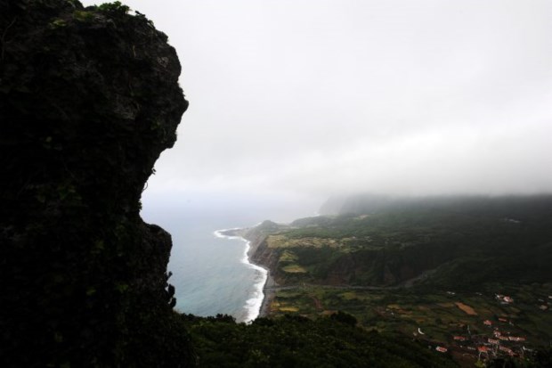 Já percebemos que daqui não levamos nada, nem por sombras conseguiremos avistar as sete lagoas que são uma das imagens de marca das Flores. Descemos, portanto, e vamos fixar-nos mais perto do mar, onde as nuvens não parecem ter tanta vida. Antes, porém, paragem no miradouro do Portal: a Fajãzinha é uma manta de retalhos de campos verdes molhados de orvalho e tem a Aldeia da Cuada por cima; a cascata da Alagoinha, talvez o maior spot da ilha, hoje não dá mais a ver do que uns risquinhos esbranquiçados na rocha de vegetação compacta; lá ao fundo, a Fajã Grande e o ilhéu de Monchique, perdido no Atlântico.