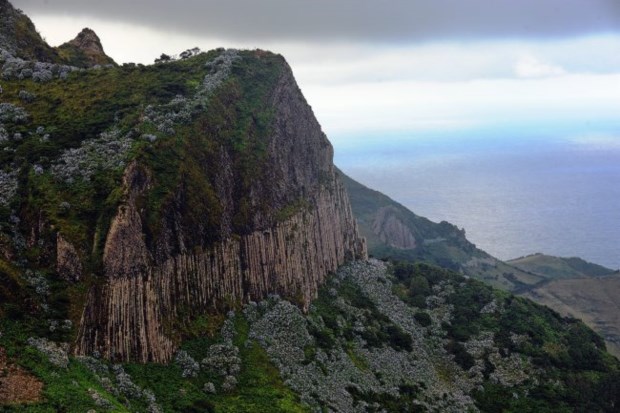 Vamos descendo, com o vento a assobiar na vegetação (canas, conteiras) e o mar a rugir lá em baixo. É bonita, a paisagem, mas há-de melhorar não tarda. Vamos escutando os melros pretos e os tentilhões, observando as faias da terra (espécie endémica) empoleiradas na encosta rochosa e sentindo o cheiro a urze, que aqui se chama queiró. Em 15 minutos chegamos a uns degraus de pedra e deste ponto a vista para o mar pode ser vertiginosa para olhos mais sensíveis. E é daqui que vemos, lá em baixo, duas casas brancas - não, três, não, quatro, são quatro pontinhos brancos que sobressaem do negro basáltico das pedras que são o chão da fajã.