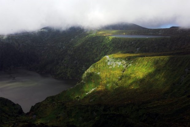 Entramos no jipe com a alma cheia. E quando, em simultâneo, alcançamos com o olhar as lagoas Funda e Rasa, damos muito mais valor ao que está a acontecer. Era justificada a angústia dos últimos dias: não podíamos deixar as Flores sem levarmos connosco estas imagens de assombro e rendição. A lagoa Funda é de uma beleza extrema, quase trágica de tão verde. Por um rasgão nas nuvens, vê-se o mar lá ao fundo. Mas o impacto é muito maior, realmente, quando estão ambas no mesmo plano de visão.