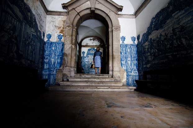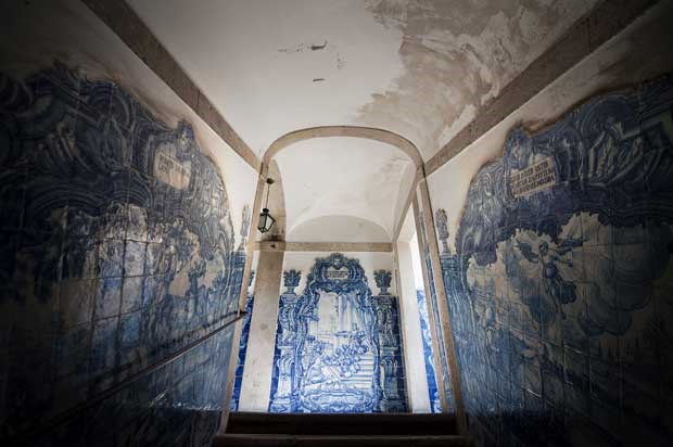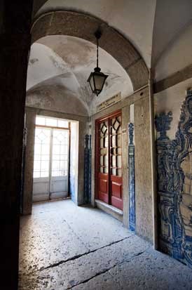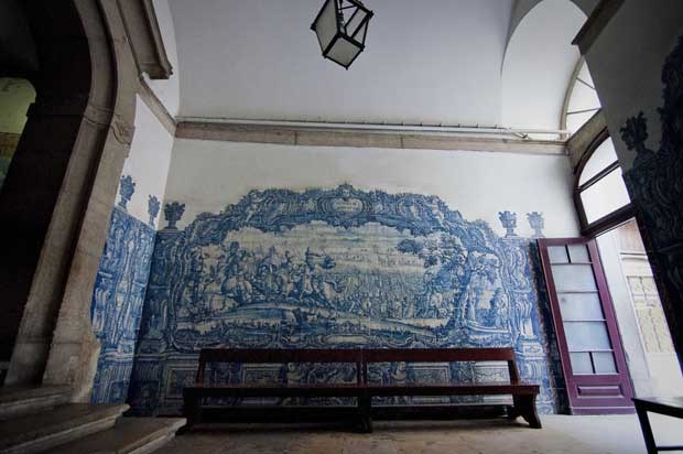 Entra-se finalmente numa portaria decorada com um majestoso lambril de azulejos azuis e brancos. Nos quadros maiores sobressaem as legendas "Victoria de Abram Em Hoba" e "Bênção de Isaac a Sev Fº Jacob" e entre os dois "Nacimento de Ioseph do Egipto". São composições impressionantes, mas indecifráveis para quem não for versado no Antigo Testamento. Mesmo sem entrar no pormenor, recorde-se que a vitória de Abrão em Hoba tem a ver com o resgate do seu sobrinho Lot, que o José aqui invocado é o filho-adivinho de Jacob e que a bênção de Isaac se prende com a rivalidade entre irmãos que deu lugar ao grande sisma das religiões monoteístas.