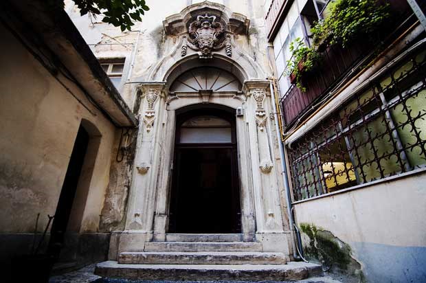 O centro comercial não é boa companhia também porque obstrui as vistas e faz estreitar a Rua da Mouraria. Não admira, portanto, se quem passa nem repara na torre de cantaria branca que ocupa o número 64. A fachada dominada por pilastras gigantes de ordem toscana é elegante e sóbria, mas no piso térreo há qualquer coisa que não bate certo.