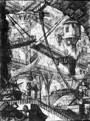 "Gravador de excepção e arquitecto falhado", no dizer do historiador de arte Robert Hughes ("Rome", 2011), Piranesi quis gizar Roma inteira, desde anfiteatros arruinados a palácios a estrear, passando por esgotos e sítios que não lembram ao Diabo. Tratou de reproduzi-los com enorme acuidade topográfica e rigor arquitectónico, tanto que muitas vezes desenhou muito mais do que via - as obras como terão sido idealizadas, ou como ele imaginava que deviam ter sido. Mas as suas visões de Roma foram muito para além disso, encenando perspectivas e combinações de vistas urbanas que nunca existiram, chegando até a estampar edifícios e mobiliário urbano da sua inteira invenção. Nas Vedute de Piranesi há palácios sobre pontes e templos sobre palácios, mas também alamedas repletas de bustos, colunas, estelas e obeliscos, todo um arsenal de peças de diferentes épocas, que se alinham para homenagear a cidade, sem se encontrarem na cidade real. E se as Veduta são uma espécie de utopia, Piranesi também produziu a sua própria distopia sob a forma dos Carceri D'invenzione, visões de prisões imaginárias, que influenciaram sucessivas gerações de artistas e arquitectos.
