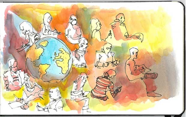 A odisseia de Luís Simões, que irá contando online e em revistas, é fácil de resumir: fazer todos os continentes, tomar tempo em cada aldeia, cada vila, cada cidade, para desenhar e conhecer outros urban sketchers (os desenhadores de diários gráficos) como ele, uma comunidade a que pertence há alguns anos.