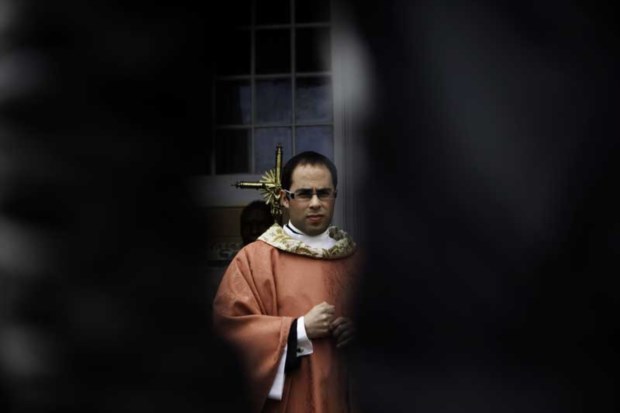 Hoje, os corvinos andam calçados, e o padre usa outro meio para chamar os crentes: um megafone. "Pedia a amabilidade de oito senhores para levarem os andores. A amabilidade de oito senhores", diz ele através do aparelhómetro, à porta da igreja. A missa terminou, e a procissão vai sair até ao Largo do Outeiro, para regressar com a Senhora dos Milagres e o Senhor dos Passos ao altar. "Oito senhores para levar os andores, se faz favor", insiste o padre Hélio Soares, que mal terminou o seminário foi colocado naquela paróquia difícil. "Oito senhores". Nada. Ninguém se oferece, e Hélio corre literalmente para os homens que vê, empurrando-os até ao andor.