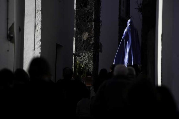 Os sinos desatam a repenicar, depois das últimas notas do coro das crianças, "Senhor tem piedade de nós", e sem nunca abafar o trovão do mar, que se vê por cada frincha entre as casas brancas. "Vamos formar duas alas, se faz favor", diz Hélio ao megafone. "Senhor Manuel, a sua ala sobe a Rua das Pedras. A outra vai pela Rua da Matriz." A procissão divide-se, avança por ruas diferentes, para se unir no Largo do Outeiro. Ali todos param, para o padre fazer o discurso, na presença dos dois andores.