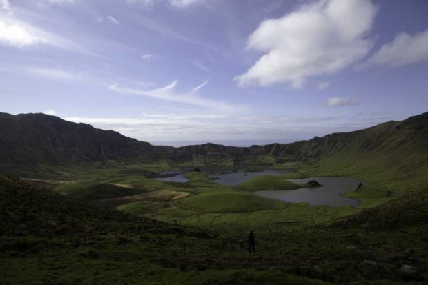 A vigia da baleia ainda existe, abandonada, situada num dos pontos mais altos da ilha. Não tão alto como o Caldeirão, que fica no fim da estrada e surge de repente, aos olhos de quem chega, como um mundo novo, subterrâneo e secreto, de beleza irreal. É a cratera do vulcão, o fosso colossal de onde nasceu a ilha, mas no seu interior não há vestígios de lava nem de enxofre, antes um forro aveludado de musgos verdes e brancos, e um fundo de lagoas e ilhotas. A toda a volta do vale recorta-se uma parede côncava e íngreme, que do lado Sul termina numa lâmina de rocha elevada a pique sobre o mar. Para o outro lado, a altitude na vertical é de 718 metros, a maior em terras que dão para o Atlântico, e a vista é um horizonte de água e de assombro.