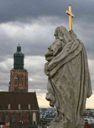 Wroclaw cresceu sobre uma dúzia de ilhas e ilhotas emolduradas pelo rio Odra e uma série de afluentes que nele entroncam por estas latitudes. A ligação entre esses pedaços de terra é hoje assegurada por mais de uma centena de pontes, entre as quais meia dúzia de obras notáveis de engenharia em ferro da segunda metade do século XIX. A mais famosa é a ponte Tumski, que liga as ilhas do Sal e da Catedral e está carregada de cadeados com corações pintados. Mas muito antes da moda criada por Tre Metri Sopra Il Cielo, o livro de Federico Moccia de 1992 transformado em filme em 2004, já a ponte Tumski era um santuário para os apaixonados polacos. É o género de local com aquela dose de magia que se divisa numa entrada para outro mundo, neste caso a ilha da Catedral. O sítio em que a cidade nasceu tornou-se um condensado de arte e arquitectura religiosas, onde se sucedem, e por vezes se sobrepõem, preciosas obras góticas e barrocas. Entre igrejas, bibliotecas, conventos e seminários, respira-se um ar de recolhimento e de meditação, mas também de vila dentro da cidade.