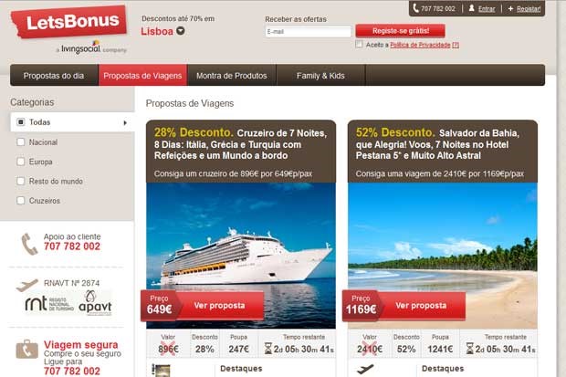 Um ano depois de ter lançado uma unidade dedicada em exclusiva ao turismo, a LetsBonus vendeu 50 mil viagens, de um simples fim-de-semana ao pacote de férias nas Caraíbas. Ricardo Mesquita, responsável em Portugal desta empresa fundada em Espanha, garante que há um equilíbrio em todas as áreas de negócio, mas devido à sazonalidade as viagens podem atingir 30% das vendas. Já Boris Hageney, presidente da Groupon para a Europa do Sul, diz que em Portugal a venda de refeições em restaurantes e os serviços de beleza são os mais procurados ao longo de todo o ano pelos subscritores do site (jovens adultos, urbanos, entre os 24 e os 44 anos).