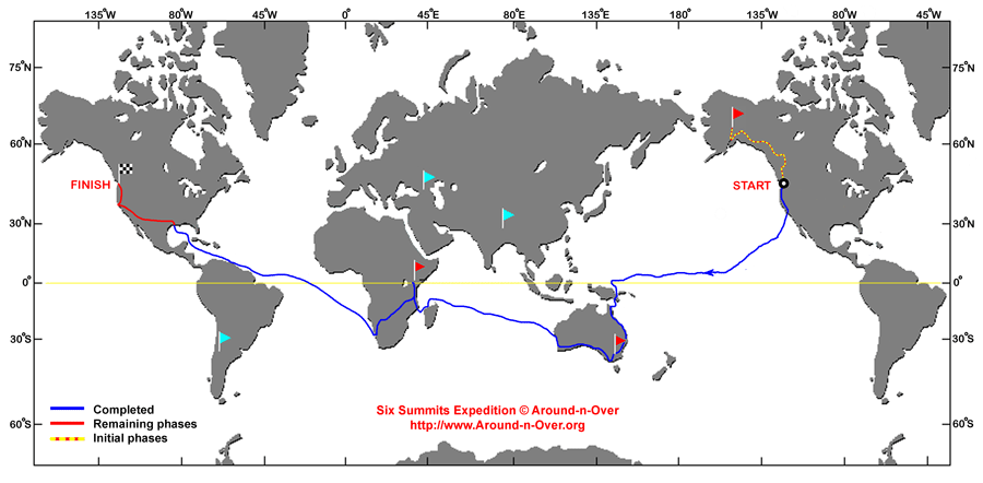 Erden começou por pedalar entre Seattle e S. Francisco. Depois atravessou o Pacífico a remos até à Papua Nova Guiné. Atravessou a ilha a pé e em caiaque e depois remou até à Austrália. Pedalou o continente australiano de Leste para Oeste e a seguir atravessou o Índico a remos até Madagáscar, primeiro, e Moçambique, depois.