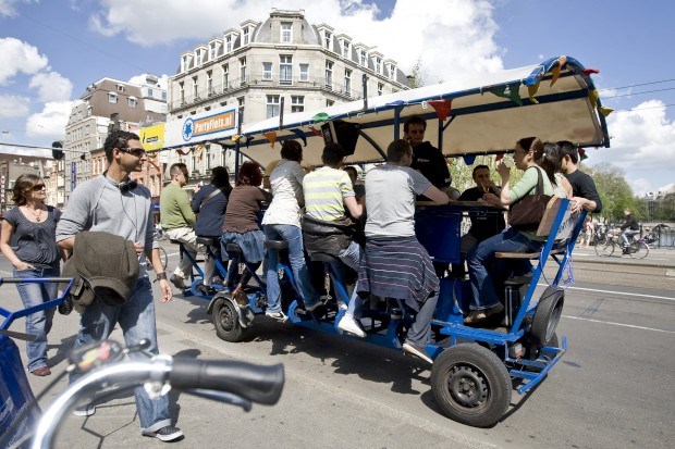 • AMESTERDÃO. Turistas pedalam e bebem cerveja e cantam karaoke num bar ambulante