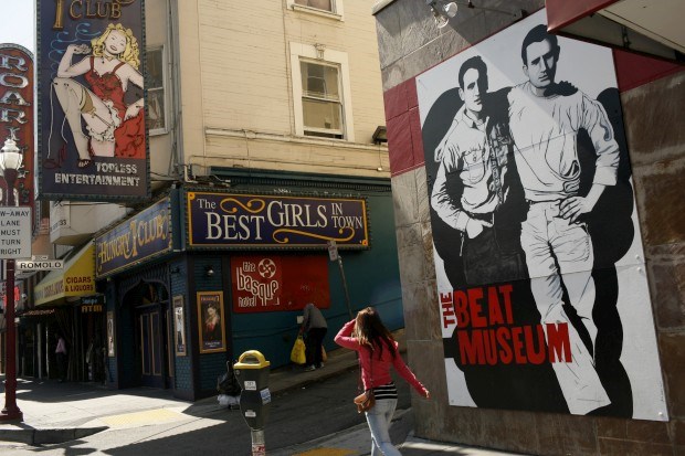 SÃO FRANCISCO. As figuras de Jack Kerouac e Neal Cassady na parede do Beat Museum Robert Galbraith