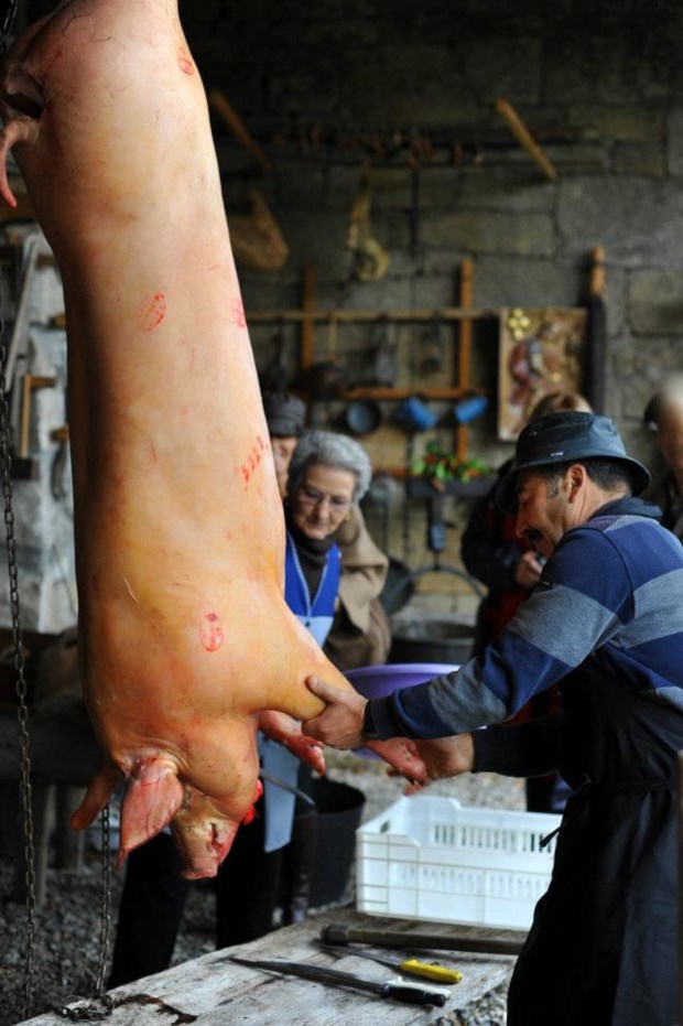Explicou tudo junto à ladeira da irmã, enquanto, lá fora, o grupo registava cada pormenor da desmancha do porco. "A matança começa ao vir a primeira geada. Uns matam em Novembro, outros em Dezembro. Geralmente, matam no sábado, no domingo ou no dia santo para convidar a família." A anfitriã tem de servir porco do ano anterior, prova de que "governou bem a casa".