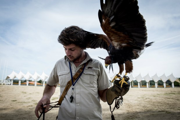 Fazemos um parêntesis nos cavalos para falar de outra arte que na coudelaria “voa” à solta, a da falcoaria, Património Imaterial da Humanidade desde 2010. Em determinados dias está incluída na visita guiada à coudelaria; nada de descabido sabendo que a falcoaria e os cavalos sempre tiveram uma relação próxima — esta modalidade de caça, das mais antigas, sempre foi acompanhada a cavalo e era uma das predilectas da realeza. Em Portugal teve o seu auge na Idade Média e, mais tarde, na segunda metade do século XVIII, altura em que a coudelaria, criada para fornecer cavalos à picaria real, começava a dar os primeiros passos. As exibições de falcoaria acontecem em dias específicos e são da responsabilidade da Caçamonte, concessionária da coudelaria. Nós assistimos ao voo livre de uma águia (JB) e um falcão (Lua).