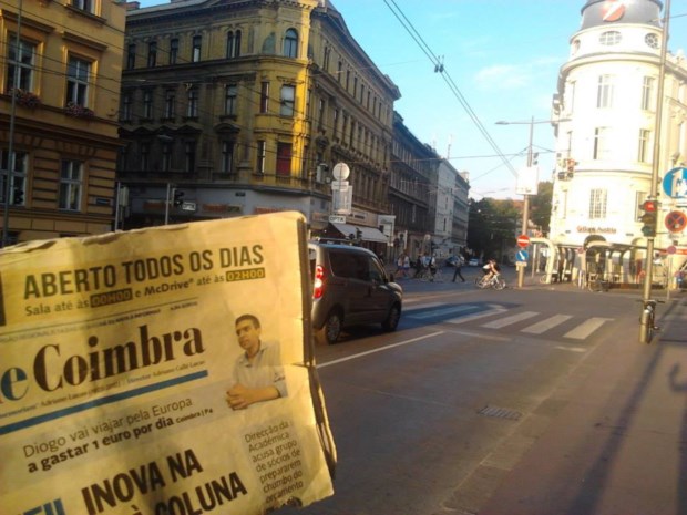 Diogo viajou sempre com o "Diário de Coimbra" onde se antecipava o projecto. "Era uma forma de dar credibilidade e autenticar o que eu estava a explicar às pessoas que ia encontrando". Aqui em Viena DR
