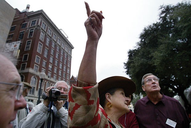Quando Oswald foi preso, no Texas Theater, o filme em exibição (ou um dos filmes, à época eram sempre dois seguidos) era um obscuro Cry of Battle, que em Portugal se chamou Quando os Abutres Voam. Ora aí está um título apropriado à atmosfera que se respira aqui. Qualquer pessoa que pare a ler uma das placas explicativas espalhadas pela praça, que olhe em volta com ar interessado, em suma, que não atravesse o lugar com a passada decidida e o ar convicto do nativo é imediatamente abordada por uma destas aves necrófagas. Numa cidade em que tanta gente tenta ganhar dinheiro à custa do assassínio de JFK, estes homens constituem a franja mais baixa e mais ostensiva do fenómeno, uma espécie de proletariado deste ramo de negócio.