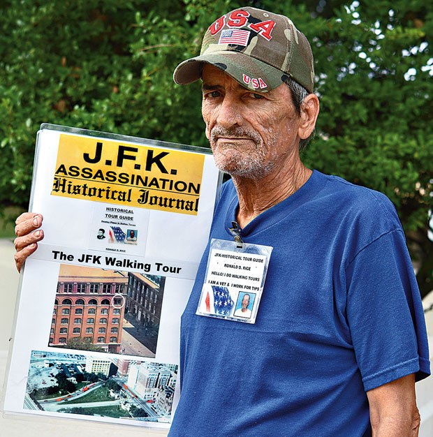 Regressamos no dia seguinte, às seis da manhã, a tempo de assistirmos aos primeiros passos deste bailado fascinante. Aproxima-se de mim um fulano branco, de rosto e corpo bastante enfrangalhados pelas investidas do tempo. Chama-se Ronald D. Rice, e se ontem nos calhou o globetrotter do turismo sanguinolento, hoje estamos perante o decano dos guias da Dealey Plaza. Ron considera-se superior (muito superior, até) aos restantes pseudoguias que aqui ganham a vida. “Sou o guia que anda nesta praça há mais tempo — dezanove anos seguidos.” Caso único, não vende revistas nem jornais. Em vez disso, traz debaixo do braço dois grandes cartões plastificados com uma panóplia de imagens e diagramas respigados aqui e ali para lhe servirem de muleta nas suas explicações. Fotografias macabras, desfocadas, feias, como não podia deixar de ser. “Não cobro uma quantia certa. Vivo exclusivamente das gorjetas. Quem não gostar da minha visita guiada não tem de pagar sequer um cêntimo.” Faltam-lhe os dentes da frente, fuma sem parar, tem os cantos dos olhos descaídos, a pele curtida e áspera. Diz que a praça nunca esteve tão bonita, tão limpa e arranjada, mas que os turistas são muito poucos, em comparação com o passado. Nos tempos que se seguiram ao filme JFK, de Oliver Stone, de 1991, os visitantes eram aos magotes, e Ron chegou a conduzir visitas para grupos de 40 ou 50 pessoas. “Agora isto está às moscas, nem mesmo o quinquagésimo aniversário vai trazer muita gente. Mal dá para uma pessoa sobreviver. Tenho a minha pensão de veterano, mas é uma ninharia, ao fim de quatro ou cinco dias já não me sobra nada.”