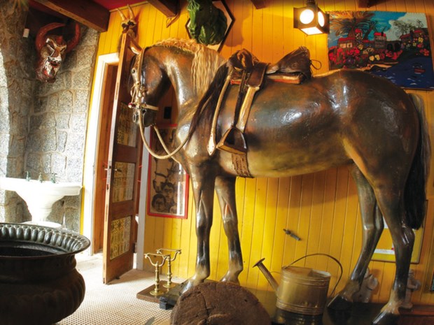 É o cavalo de Temuco, localidade a dois passos da aldeia onde Neruda nasceu, no sul do Chile. Para ele, foi construído na Isla Negra um compartimento “muy lindo”, “la pieza del caballo”. Ah, sim, a casa ia crescendo à medida dos objectos, como uma peça que se desdobra consoante as necessidades, e desenhada por Neruda para dar forma à sua fantasia. A casa estava sempre em obras, “foi crescendo como as pessoas e as árvores”, dizia.