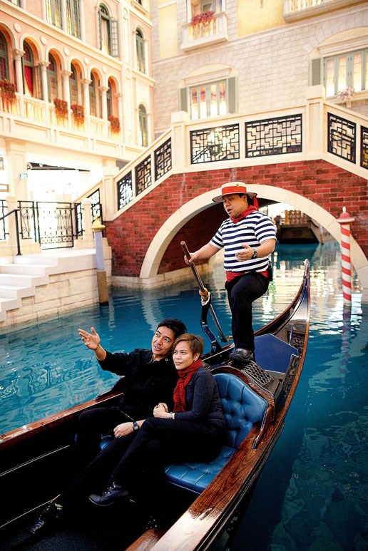 Como é que se diz O Sole Mio em mandarim (ou cantonês)? O gondoleiro veste calças pretas, camisa riscada, chapéu de palha e fita vermelha. Maneja o remo com destreza, desliza na água azul-piscina. Os passeantes abraçam-se como amantes de Veneza, sorriem, tiram fotografias. Têm uma felicidade atónita, o paraíso é mesmo ali. Talvez lhes falte o sol. O astro-sol, não o sole. Mio. Suo. O dia está ameno, com nuvens esparsas, de um branco algodão-doce. Um eterno dia de Primavera.