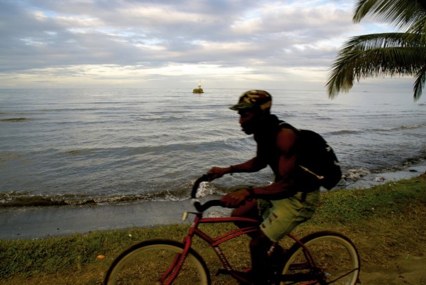 A mulher parecia pouco interessada em alugar o quarto, tinha o pensamento distante, tudo o que rogava, com o olhar furtivo que me lançava, era que, fosse qual fosse a decisão, a tomasse rápido. Resignado, optei por pernoitar na Bendition de Dios, uma verdadeira bênção para o corpo que carreguei para a rua, ao início de uma manhã com um céu coberto de nuvens brancas e cinzentas, caminhando sempre na direcção do ancoradouro, de onde chegam aos meus ouvidos conversas indecifráveis. Sentado num restaurante, com um elegante alpendre em madeira pintado em tonalidades suaves, testemunho a agitação produzida pelo regresso do mar de pequenas embarcações de onde os pescadores descarregam o peixe para o cais. Uma criança contemplativa, encimada por um anúncio à cerveja Gallo, está sentada ao lado dos seus modestos chinelos, pernas e olhos caindo sobre a água envolta pela bruma que, a pouco e pouco, começa a dispersar-se.
