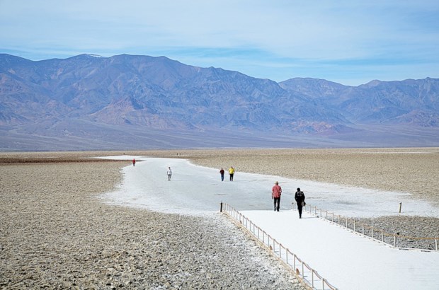 Estamos ainda praticamente no início do Vale da Morte, uma depressão a norte do deserto de Mojave, que, ao longo de mais de 200km, marca a fronteira entre os estados da Califórnia e do Nevada. A zona é tão conhecida pelas altas temperaturas – que, no Verão, já atingiram os 57º C (valor registado a 10 de Julho de 1913 e que mantém o estatuto do segundo mais alto registado até hoje) – como, mostram-nos as placas e avisam-nos os locais em Furnace Creek, onde paramos para almoçar (um hambúrguer, claro!), pelas inundações instantâneas (flash floods). Uma destas, em 2013, deixou a estrada que passa em Badwater, uma das atracções do local, intransitável durante meses. E, em Agosto de 2004, uma tempestade foi inclusive a causa da morte de duas pessoas, destruindo a estrada que liga o Vale da Morte a Las Vegas – a chuva acabou por exigir obras de oito meses que se saldaram em cerca de dez milhões de dólares.