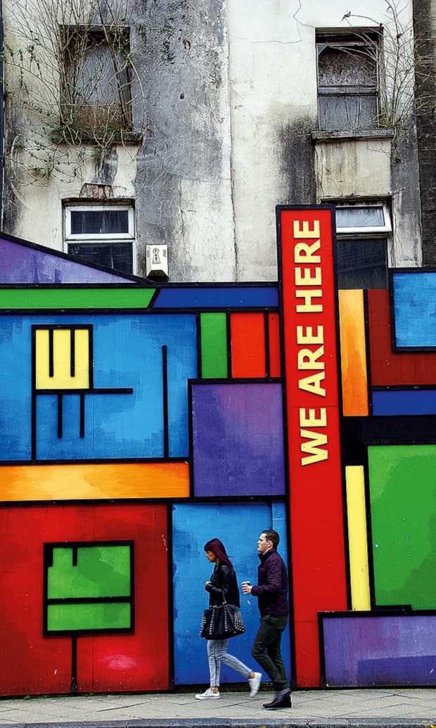 Solitário, apenas na companhia do estigma motivado pelas palavras de Dylan Thomas, o poeta nascido na ugly lovely city, parto à descoberta de Swansea sob a abóbada do mundo pintada de nuvens acasteladas, embrenhando-me pela, àquela hora, quase deserta High Street, em tempos a mais importante rua de comércio da cidade e actualmente alvo de um projecto de regeneração que envolve artistas locais. Na fachada de um prédio decrépito, um mural de cores vivas funciona como antecâmara para um conjunto de humildes casas em tons de pastel e, uma vez deixada para trás a Castle Street, em parte poupada pelos bombardeamentos durante a II Guerra Mundial, alcanço a Castle Square, dominada pelo seu castelo em ruínas. Erguido no século XIV, foi parcialmente destruído em 1648 por Oliver Cromwell, tenente-general enviado por Londres para colocar um ponto final na rebelião no sul de Gales e que, depois, se estendeu a outras zonas – um período que mais tarde justificou a designação de II Guerra Civil.