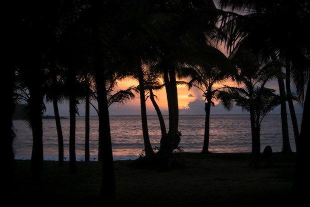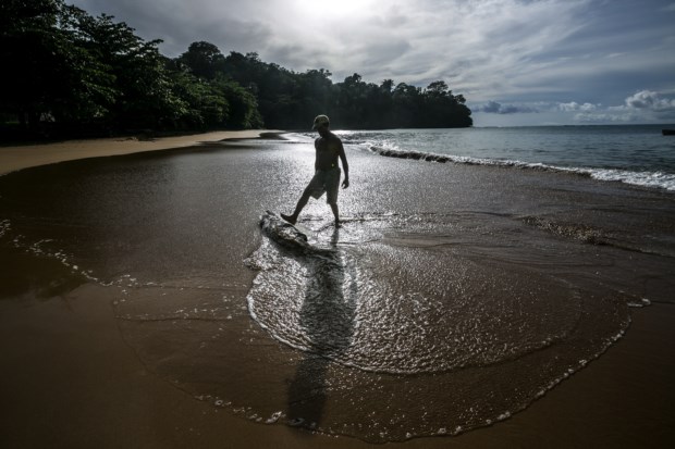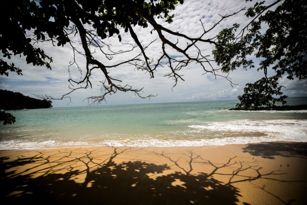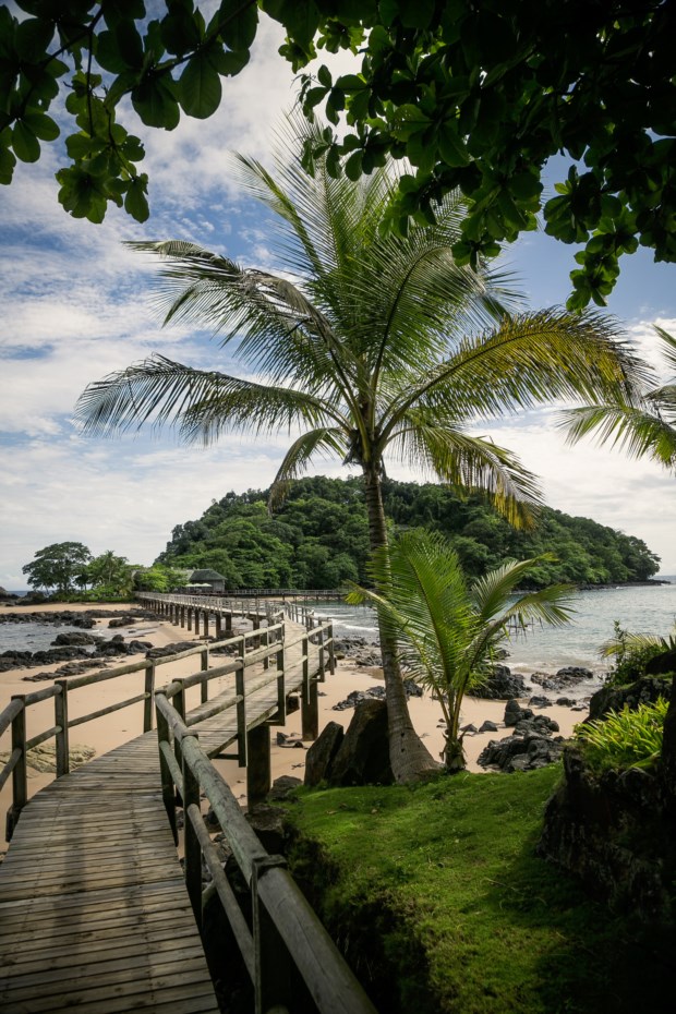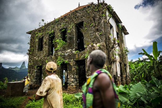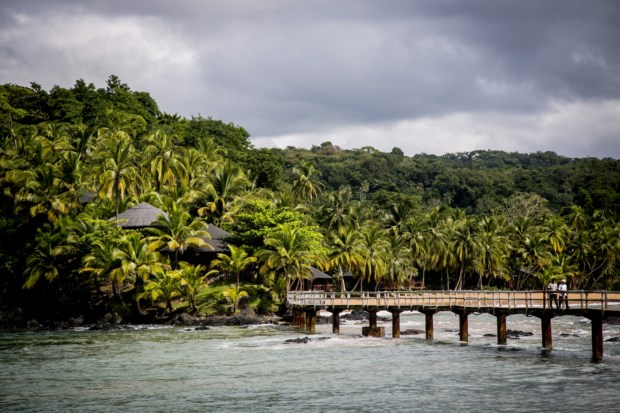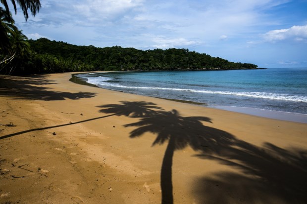 Estamos à beira do precipício, ribomba a trovoada pelo Golfo da Guiné e por ali abaixo até ao mar há rocha, coqueiros, areias virgens e memórias de escravos. O mar vai do verde-água ao azul cobalto, sempre cristalino, e recambia qualquer adulto empedernido à infância despreocupada. É vê-los, viajantes solitários, a correr até à água de sorriso rasgado, ou a deixar que o mar faça o seu vaivém enquanto os enrola na areia clara da praia Banana. Na ilha do Príncipe, a irmã mais pura de São Tomé, há duas partes, sempre verdes: “A floresta junto à praia é coqueiro, mais para dentro é eritrineira — dava sombra ao cacau.” O turismo e a colónia. A trovoada quente avança sobre nós depois de dias de sol reluzente. O tempo está a mudar. O Príncipe também.