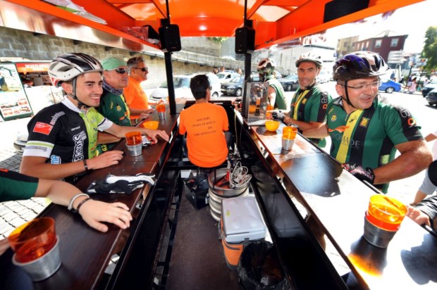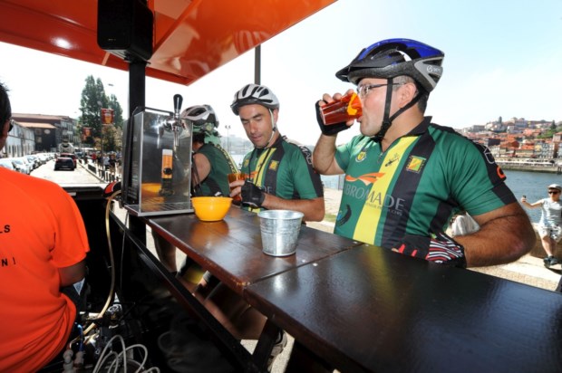 A PartyBike — já presente noutras cidades portuguesas — é uma bicicleta colectiva não poluente que pode transportar um máximo de 18 pessoas (10 a pedalar) e tem baterias que fornecem iluminação, fazem funcionar as duas colunas de som e — muito importante — mantêm as bebidas refrigeradas. O serviço presente no Porto tem uma parceria com aSovina — e no preço da viagem está incluído um copo desta cerveja artesanal (ou de água ou sumo, para quem não apreciar cerveja).