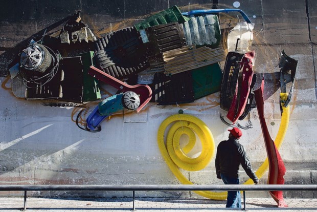 Quando chegou a Bragança, vinda de Londres, onde vive, Zabou já trazia os stencils prontos e menos de dois dias depois aqui estamos, vista para o Instituto Politécnico de Bragança e Home Street Home diante de nós. “É pobre”, explica uma mãe ao filho, num passeio matinal domingueiro. Pobre é a rapariga que dorme no muro pintado por Zabou com um cenário urbano por trás — inspirado pelo casario da Ribeira portuense, que a artista francesa viu apenas em fotografias. “Se pudesse alterar alguma coisa seria a cor dos telhados”, nota, “percebi que aqui são sempre vermelhos”. No mural, de oito metros, o maior que Zabou, 24 anos, já pintou, a paleta de cores varia entre o azul, o branco e apontamentos de amarelos (incluindo alguns telhados) — e não é por acaso. A sem-abrigo representada dorme enrolada numa bandeira da UE, a perversão do home sweet home. “É uma afirmação política”, assume a artista. Pareceu-lhe adequado a este trabalho, aqui, nesta região rural, neste momento, de pobreza galopante. “Muitas pessoas, incluindo amigos meus, tiveram de emigrar ou estão a debater-se com situações muito difíceis. A crise atingiu a Europa fortemente, sobretudo no sul, em países como a Grécia, Espanha, Itália e Portugal.”