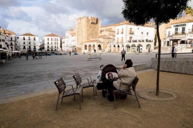 É um final de tarde ligeiramente diferente na Plaza Mayor de Cáceres. Na escadaria do Ayuntamiento, num dos topos desta praça inclinada, um grupo de mulheres pára em silêncio, segurando uma faixa roxa. Detemo-nos na imagem por acaso e parecemos ser os únicos. A vida corre normal por aqui: revoadas de pássaros negros sobrevoam a praça, as esplanadas começam a encher-se, há encontros e passeios (caninos, muitos), passam trotinetas e skates fazendo soar o empedrado, um casal ensaia os primeiros movimentos em segway sob os olhares atentos dos guias antes de desaparecerem todos rumo ao centro histórico, há quem descanse na longa escadaria que leva ao Arco de la Estrella e quando de repente do céu cinzento se escapam uns raios de sol muitas máquinas fotográficas se erguem, felizes, com a benesse inesperada que doura a pedra das muralhas e faz brilhar mais intensamente o branco da praça.