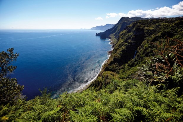A cabine, de vidraças rasgadas ao mar, vai subindo, subindo, quatro minutos que nos parecem muitos mais, a fajã cada vez mais pequena, a costa rendilhando-se até ao horizonte. Durante estes dias vamos constatar que não há espaço para medo de alturas na Madeira. Ainda bem. Não há vertigem que vença esta paisagem.