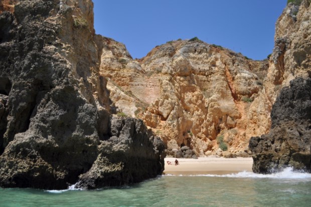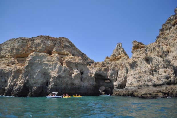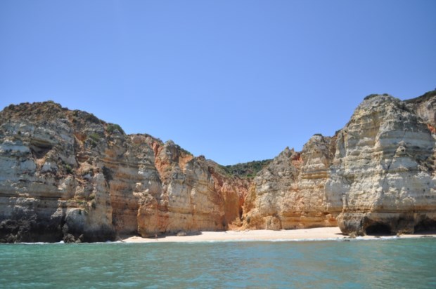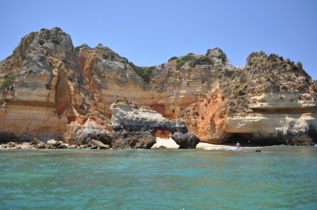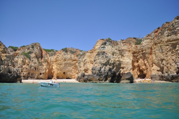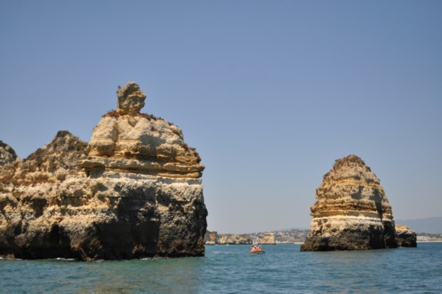 Vamos sensivelmente a meio da viagem, a partida feita junto à Avenida dos Descobrimentos. É o local de embarque mais distante da Ponta da Piedade (centro nevrálgico do passeio, onde fica a maioria das grutas propriamente ditas), mas em compensação temos a panorâmica mais abrangente de toda a costa, um desfilar de praias sem fim e da história que as acompanha. Primeiro o Forte Ponta da Bandeira e o areal do Cais da Solaria, onde em tempos ficava a lota do peixe. A praia Formosa, mais conhecida por praia da Batata, “talvez porque antigamente as pessoas do campo só vinham tomar banho de mar uma vez por ano [a tradição ainda hoje é comemorada com festas durante a noite de 29 de Agosto] e traziam comida, muitas vezes batatas doces”, avança José Jorge.