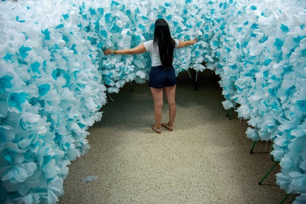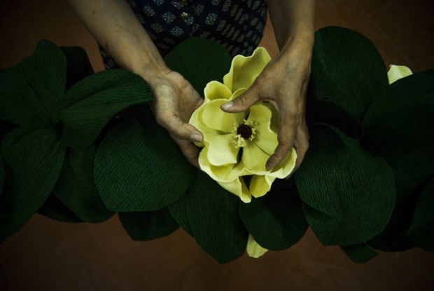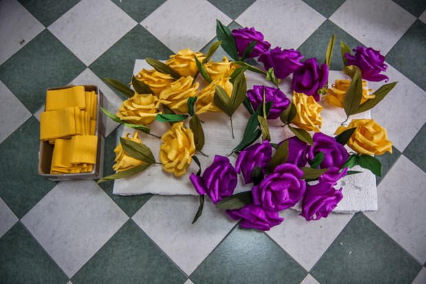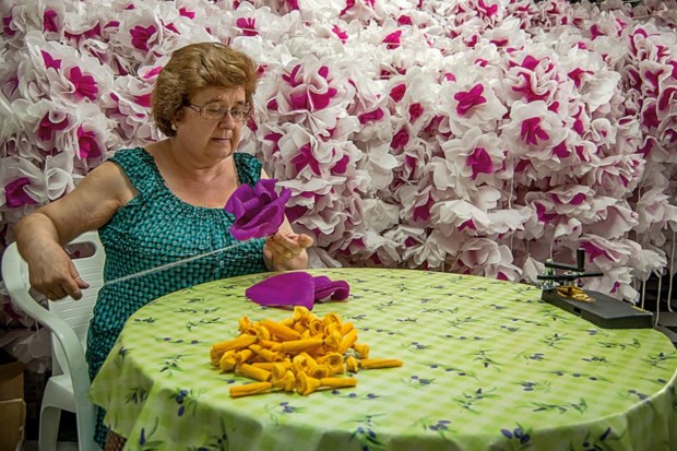 Para conseguir terminar tudo a tempo, há quem acorde às 6h para fazer flores antes de ir para o emprego, outros aproveitam a hora de almoço ou os tempos mortos nas lojas onde trabalham. Para a maioria, as noites e os fins-de-semana são de dedicação religiosa às festas. Ao final do dia, uma porta entreaberta em cada rua esconde um grupo de vizinhos entre caixotes de flores, algazarra e rostos concentrados. “Deitas-te a pensar no que tens de fazer de manhã e acordas a pensar no que tens para fazer o dia todo”, solta Teresa. Sabe os números de cor. “Cada fio do tecto tem 5m e leva 35 flores, são mais de 100. Depois temos 60 cordas no meio, 20 flores cada, mais 60 cordas nos lados e 60 colunas”. “É muito trabalho, mas nesse dia é como na casa das noivas, aparece tudo feito”, ouvimos-lhe agora, a mesma comparação repetida por outros moradores.