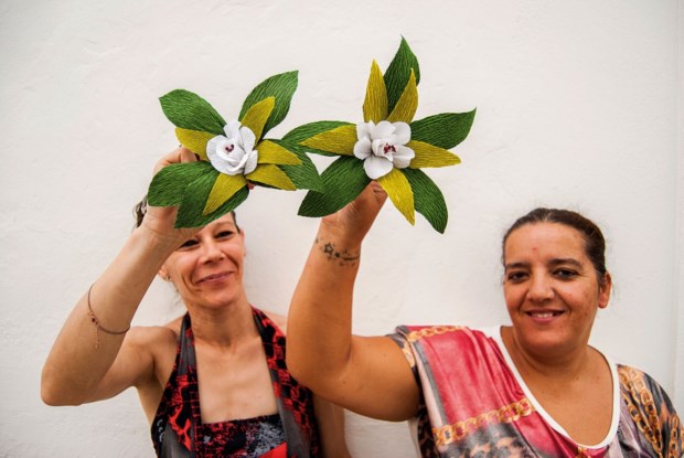 Na loja de tintas de Maria Manuela, as latas alongam agora as noites com flores de papel e ramos de hera por companhia, o grupo de vizinhas senta-se em cadeiras de praia, enlaçam-se folhagens sem tempo a perder. Um pouco mais à frente, ainda na Rua 25 de Abril, os carros deram lugar a ramadas de flores brancas na garagem de Fátima Travassos e qualquer sítio serve para pendurar os fios floridos que formarão o tecto da rua durante a festa: as hastes de uma cabeça de veado decorativa, os pratos de parede da sociedade columbófila, o prego que segura um grande leque pintado. Na Casa do Sporting trocaram-se as minis e o futebol por um mar de papel de todas as cores e as salas das antigas escolas da vila estão transformadas em campos de flores.