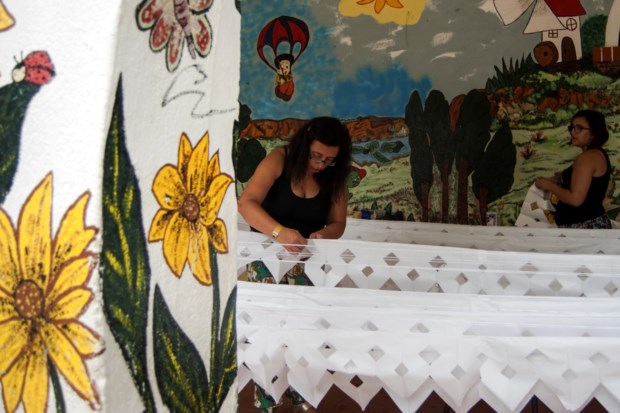 Há grupos que já moldam papel desde os primeiros meses do ano, outros tentam recuperar o tempo perdido. Na Rua Capitão Manuel António Vieira, por exemplo, a decisão de participar só avançou no final de Abril. Dos 13 imponentes arcos — com mais de três metros de altura e iluminação interior — poucos estavam terminados a um mês das festas. “Temos de fazer mais de 500 flores por dia para conseguir acabar”, revelava Luís, sem que o entusiasmo desarmasse. Durante 15 anos viveu em Lisboa, “metia sempre férias de propósito para vir na semana das festas”. Agora, de regresso à terra natal, participa na decoração de uma rua pela primeira vez. “Sempre estive ligado às artes e à arquitectura. Isto é artístico, é inventar... vamos fazer”, sorri.