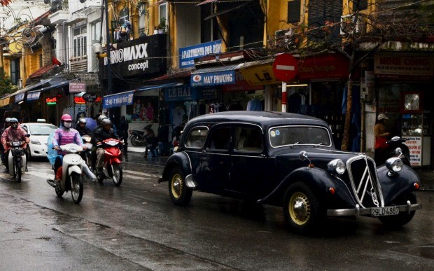 Ao longo da Hung Vuong passamos por grandes vivendas da era colonial e por um largo cruzamento com intenso tráfego de milhares de motoretas — qualquer andarilho das ruas de Hanói cedo se achará a comparar, com estranheza, a discrição sonora destas motorizadas com o nível de ruído que é o padrão dos veículos de duas rodas lusitanos.