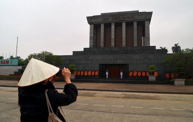 Em poucos minutos estamos na Praça Ba Dinh e temos o mausoléu à vista, com a sua arquitectura solene de granito cinzento, um pouco intimidante naquela bizarra amálgama de Pártenon e mastaba, e com um friso de guardas fardados de um branco virginal. Estão sempre atentos aos movimentos da multidão. Cá fora há uma linha que os artistas das selfies não podem transpor e lá dentro uma vasta colecção de outros interditos: reina uma atmosfera de cariz religioso que há que respeitar imperiosamente, desde o silêncio absoluto à proibição de telemóveis, fotografias, mãos nos bolsos, etc. Neste cenário de veneração — inspirado no moscovita túmulo de Lenine —, a dimensão religiosa parece levar a palma à reverência política que o Partido Comunista do Vietname aspirou pôr em prática com o mausoléu e um programa metódico de culto da personalidade. Contra, diz-se, a vontade expressa por Ho-Chi-Minh, que terá manifestado o desejo de ser cremado.