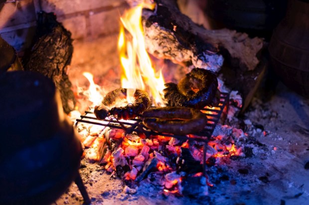 Há uma lareira de xisto contra uma parede de xisto com fumeiro pendurado — e alheiras a assar entre as panelas de ferro —, há uma televisão no canto, fotografias a preto e branco de rostos que nos olham do passado, ferramentas de carpintaria na parede. As paredes são brancas com lambril vermelho, sofás vários de cor cinza e um banco de madeira pintado de branco ao lado da lareira.