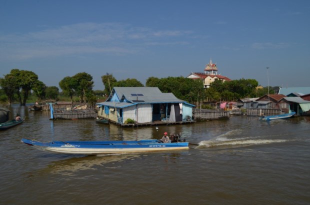 A primeira aldeola flutuante, se não se contar Cheong Khneas, o porto de partida: casinhas móveis, flutuantes, com telhados de zinco, uma igrejinha azul, casebres com ar de galinheiros onde mora gente, um edifício governamental todo janota, muitos barcos nas suas fainas de pesca e de transporte de mercadorias deslizando por uma larga avenida de água, crianças brincando nos únicos quintais possíveis, metidas em grandes bacias de alumínio a fazer de barquinhos de brinquedo.