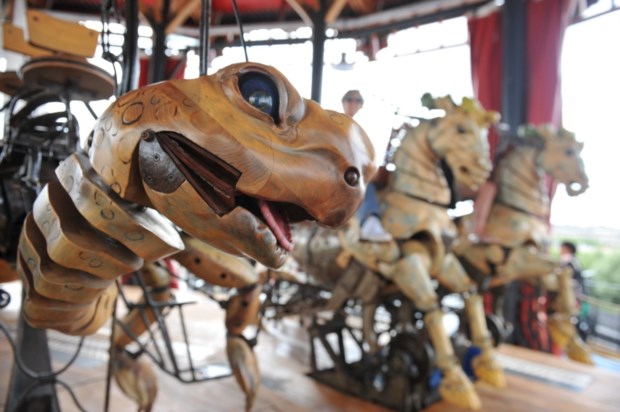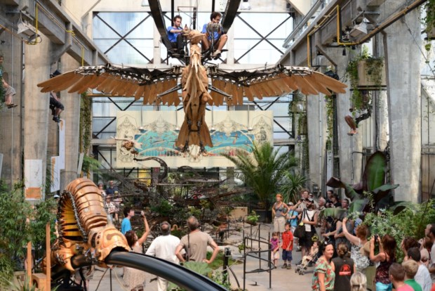 No entanto, o projecto artístico das Máquinas da Ilha — do qual ainda fazem parte o Carrossel dos Mundos Marinhos (e como não recordar, mais uma vez, as aventuras do capitão Nemo em 20 Mil Léguas Submarinas?) e a Galeria (povoada pelos vários animais robotizados que no futuro habitarão a Árvore das Garças, o terceiro e ambicioso projecto, ainda sem data) — une não só o mundo literário de Júlio Verne, como “o universo mecânico de Leonardo da Vinci e a história industrial de Nantes”. “Quisemos aproveitar a reurbanização da ilha de Nantes para trazer máquinas também elas urbanas”, começavam a contar os criadores do projecto num vídeo de apresentação quando os abandonámos para ver chegar o paquiderme hidráulico e invejar os seus 50 passageiros que nos olham de telemóveis em punho.