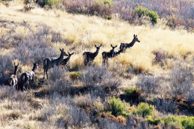 Passa a correr uma fêmea e todos ficamos quietos, contemplando a passada elegante e ágil. Passa a uns bons metros de nós, mas a respiração como que se sustém, involuntariamente: não queremos correr o risco de perturbar a sua evolução no cimo deste monte gasto, de afloramentos quartzíticos que refulgem na luz matinal como manchas aquosas. Desaparece no seu limite e os binóculos são sacados para vasculhar a paisagem. Vemo-la minutos depois, na encosta do monte seguinte, com companhia. Outra fêmea e, a persegui-las, um macho. Não dura muito a visão, desaparecem na curva do monte. A tempos, ouviremos sons guturais que nos chegam de várias direcções: é o veado a bramar.