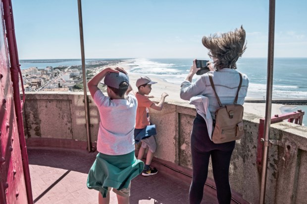 Subimos até ao topo, mais de 200 degraus, com calma, parando de vez em quando para recuperar o fôlego. Lá em cima, o vento abranda alguns minutos, o suficiente para sairmos para o exterior e ver a vista a toda a volta: a barra da ria de Aveiro, que o farol guarda, a praia da Barra, a Gafanha da Nazaré, lá mais ao longe a Costa Nova e Ílhavo, onde a vista já não alcança.